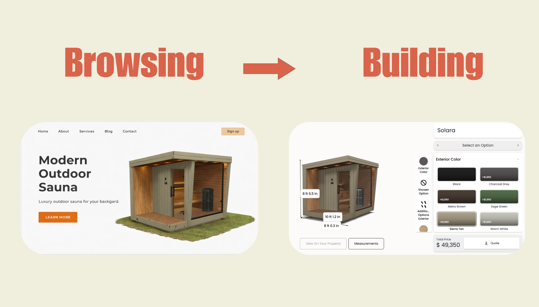 Buying a sauna, pergola, gym equipments or a luxury watch online is not just an add to cart commerce. It’s a high ticket decision with high variance outcomes. The same base product can branch into hundreds (sometimes thousands) of valid configurations. And when the investment is big, uncertainty gets expensive.